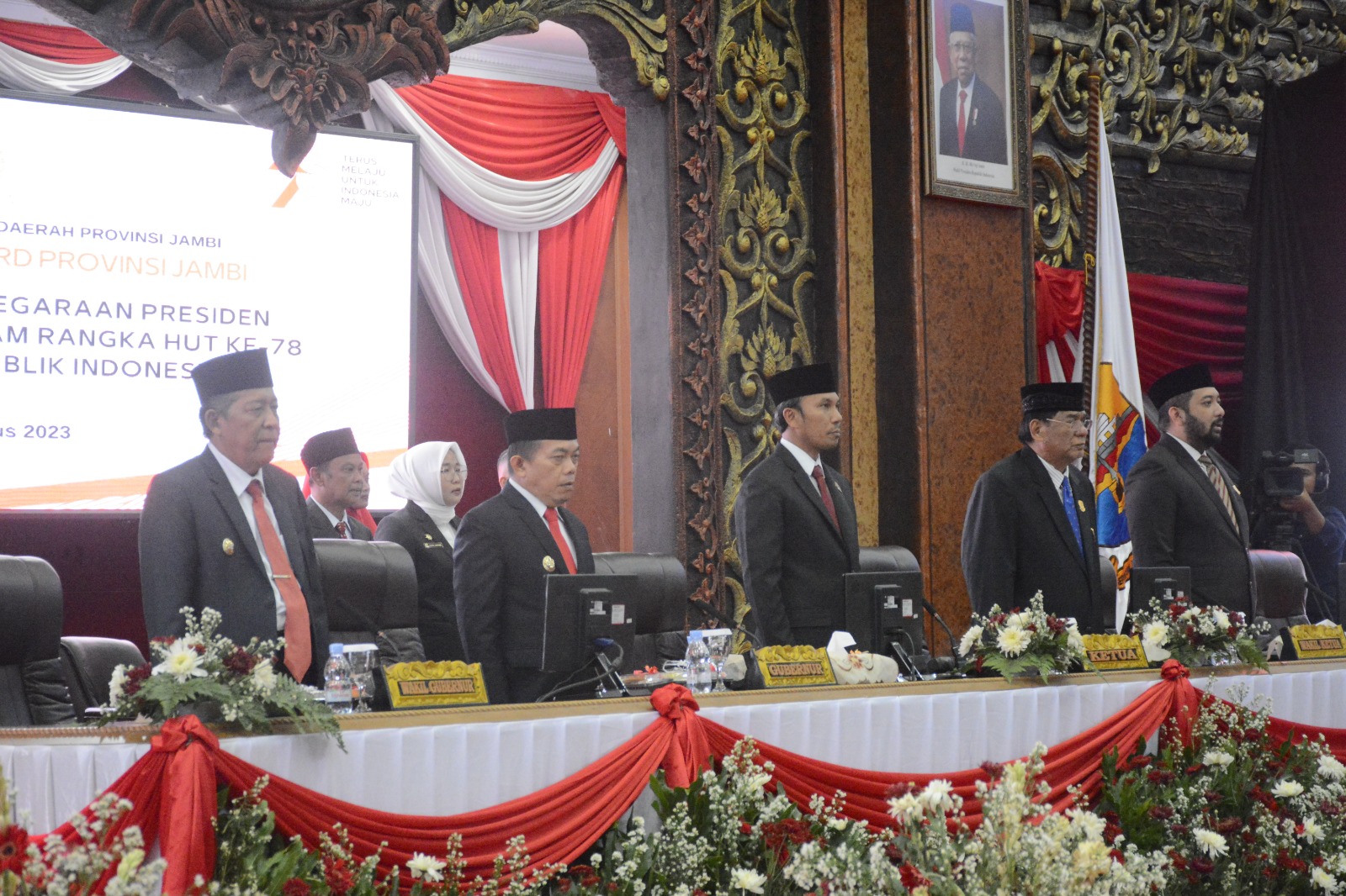 LAMANJAMBI.COM, — DPRD Provinsi Jambi menggelar rapat paripurna dalam rangka mendengarkan pidato kenegaraan presiden republik indonesia dalam rangka HUT ke 78 Kemerdekaan Republik Indonesia, Rabu (16/8).