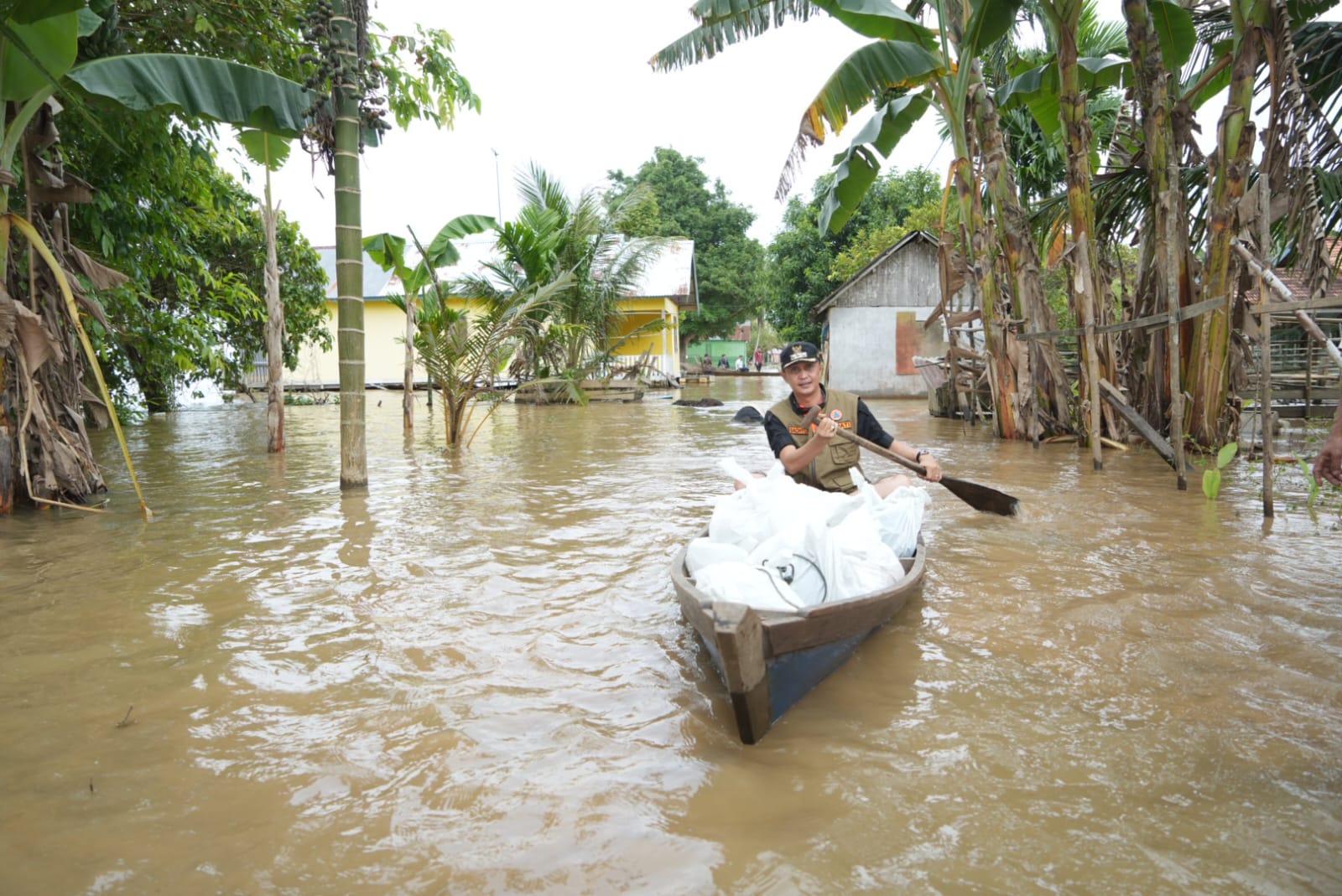 Dengan menggunakan perahu, Bachyuni mendatangi satu persatu rumah warga dan memberikan bantuan berupa sembako kepada korban banjir.