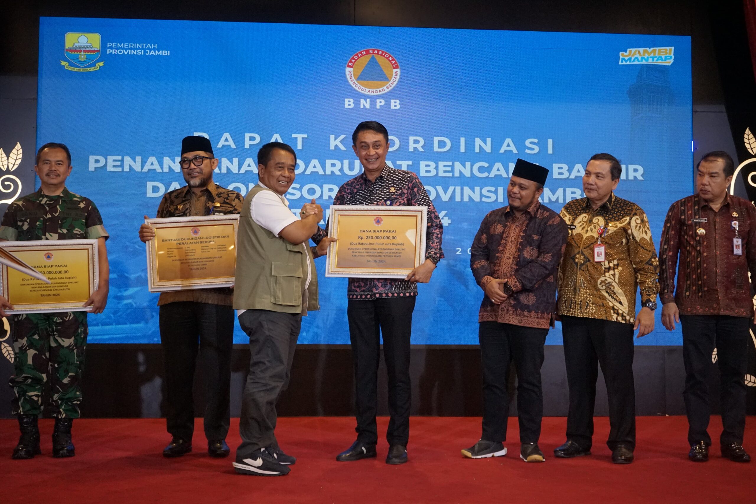 Dalam acara ini juga penjabat Bupati Kabupaten Muaro Jambi Bachyuni Deliansyah SH. MH mendapatkan bantuan dana siap pakai dan bantuan logistik serta peralatan dari Deputi BNPB pusat.