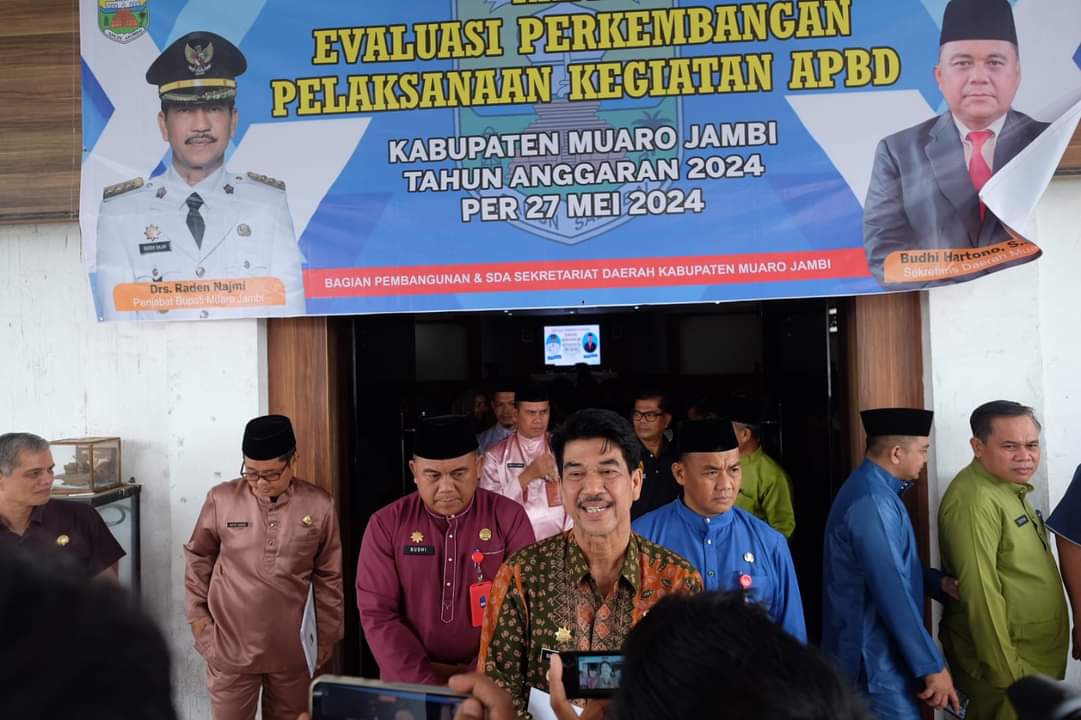 LAMANJAMBI.COM, – Penjabat Bupati Muaro Jambi Drs. Raden Najmi memimpin langsung Rapat Evaluasi Laporan dan Pelaksanaan Kegiatan Pembangunan Pemerintah Kabupaten Muaro Jambi tahun 2024 diruang Pola Nang Inang Kantor Bupati Muaro Jambi, Jumat (31/5/2024).