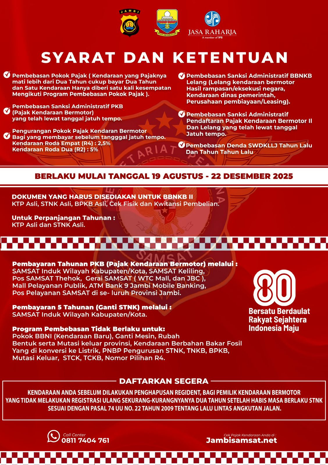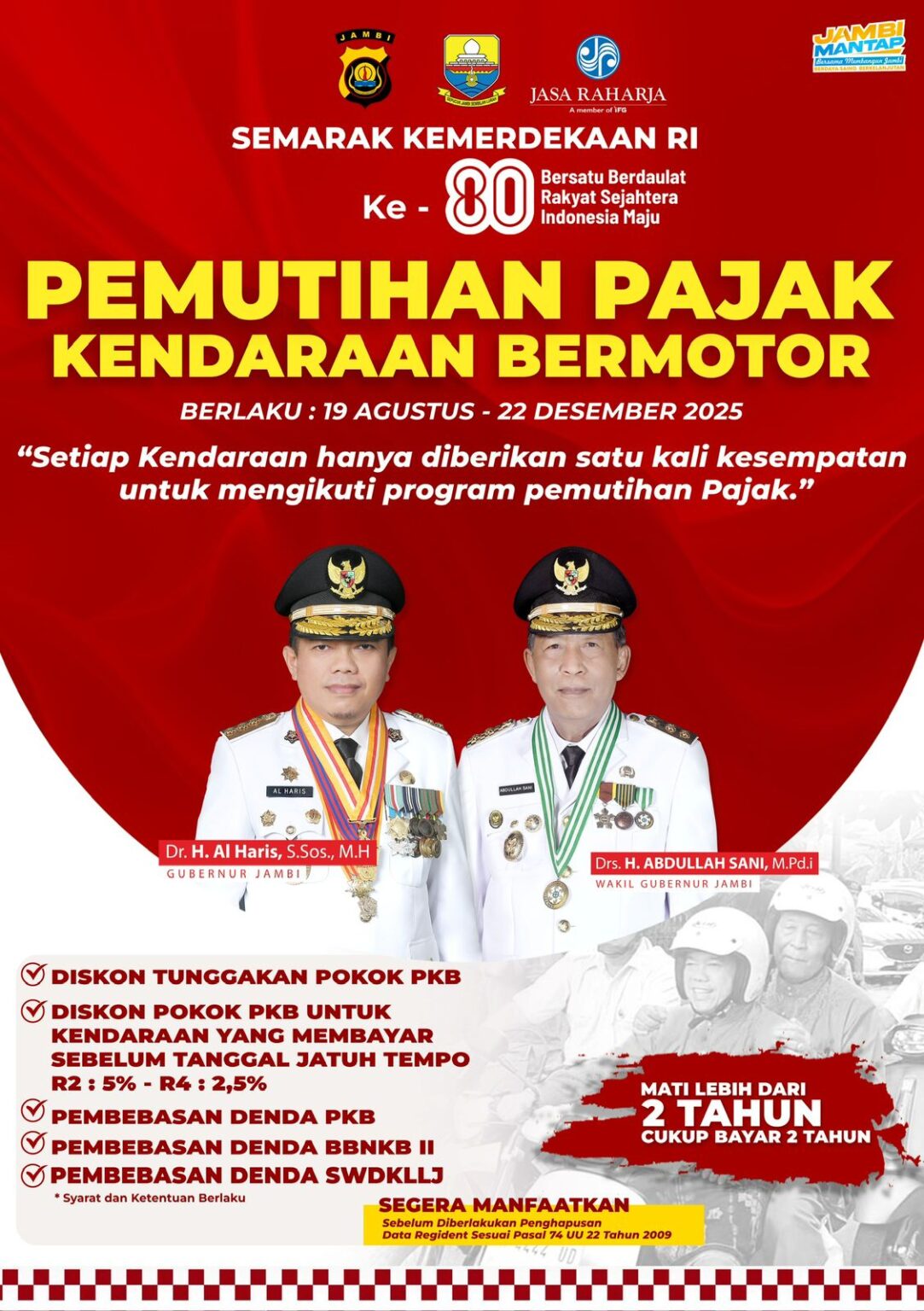 Program pemutihan pajak kendaraan ini berlaku mulai 19 Agustus hingga 22 Desember 2025 dan terbuka bagi seluruh wajib pajak kendaraan di Provinsi Jambi.